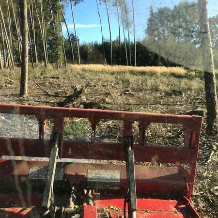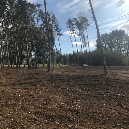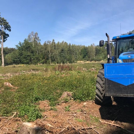 Mit unserer neuen Forstfräse können wir stehendes und liegendes Holzmaterial von Schlagabraum bis hin zu Wurzelstöcken zerkleinern. Das Holzmaterial wird dabei zerkleinert und verbleibt in Form von Holzspänen gleichmäßig verteilt auf der Fläche. Es werden somit optimale Bedingungen für die folgende Aufforstung geschaffen. Das Mulchgut bildet einen Verdunstungsschutz , hemmt den Grasaufwuchs und verbessert somit zusätzlich die Fruchtbarkeit des Bodens. Die Fräse kann bis zu 10 cm tief arbeiten und ist für Forstflächen und Gebüsche ausreichend. Für die Umwandlung in eine landwirtschaftliche Fläche ist eine tiefere Fräsung nötig, dies geschieht im zweiten Fräsvorgang mit einer Rodungsfräse.